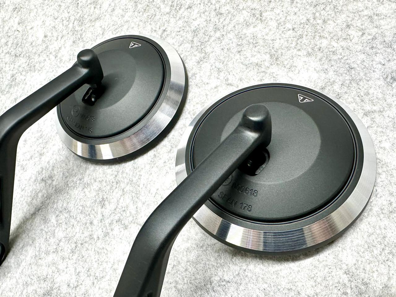Зеркала Triumph представляют собой пару стильных черных анодированных торцевых зеркал с контрастной обработкой и логотипом, выгравированным лазером.